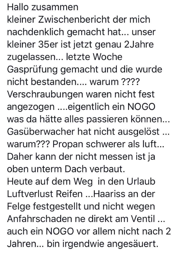 Nach 2 Jahren kann sich eine Verschraubung auch mal gelöst haben. Die Gasanlage ist nun mal nicht Wartungsfrei. Die Komponenten müssen ja austauschbar sein. Jeder Nutzer weiß das der Gas Alarm nicht das Austreten von Propan melden kann wenn dieses nach unten austritt.Wenn man während der Fahrt im Rückspiegel den Aufbau beobachtet sieht man die Verwindungen. Jedes Schlagloch, übersehene Fahrbahn Erhöhung oder Schotter Pisten über viele Km, das zerrt an den Verschraubungen. Die Hauptuntersuchung für das Auto lasst ihr ja auch nicht ohne Werkstatt machen. Die Felge gehört zum Basisfahrzeug FIAT? dem Marktführer, wenn der nun bei HYMER gelandet wäre? oder glaubt ihr das wir die schlechteren Chassis bekommen?