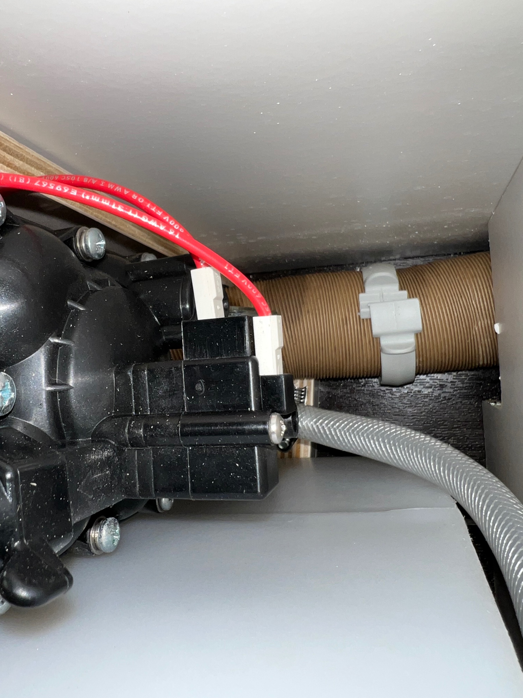 Die Druckwasserpumpe wird jetzt hinter dem Frischwassertank an die Außenwand von innen verschraubt. Auf einer Halterung mit 4 Schrauben mit Gummipuffern. Wobei man an die unteren 2 nur nach Ausbau des Frischwassertanks rankommt!!!