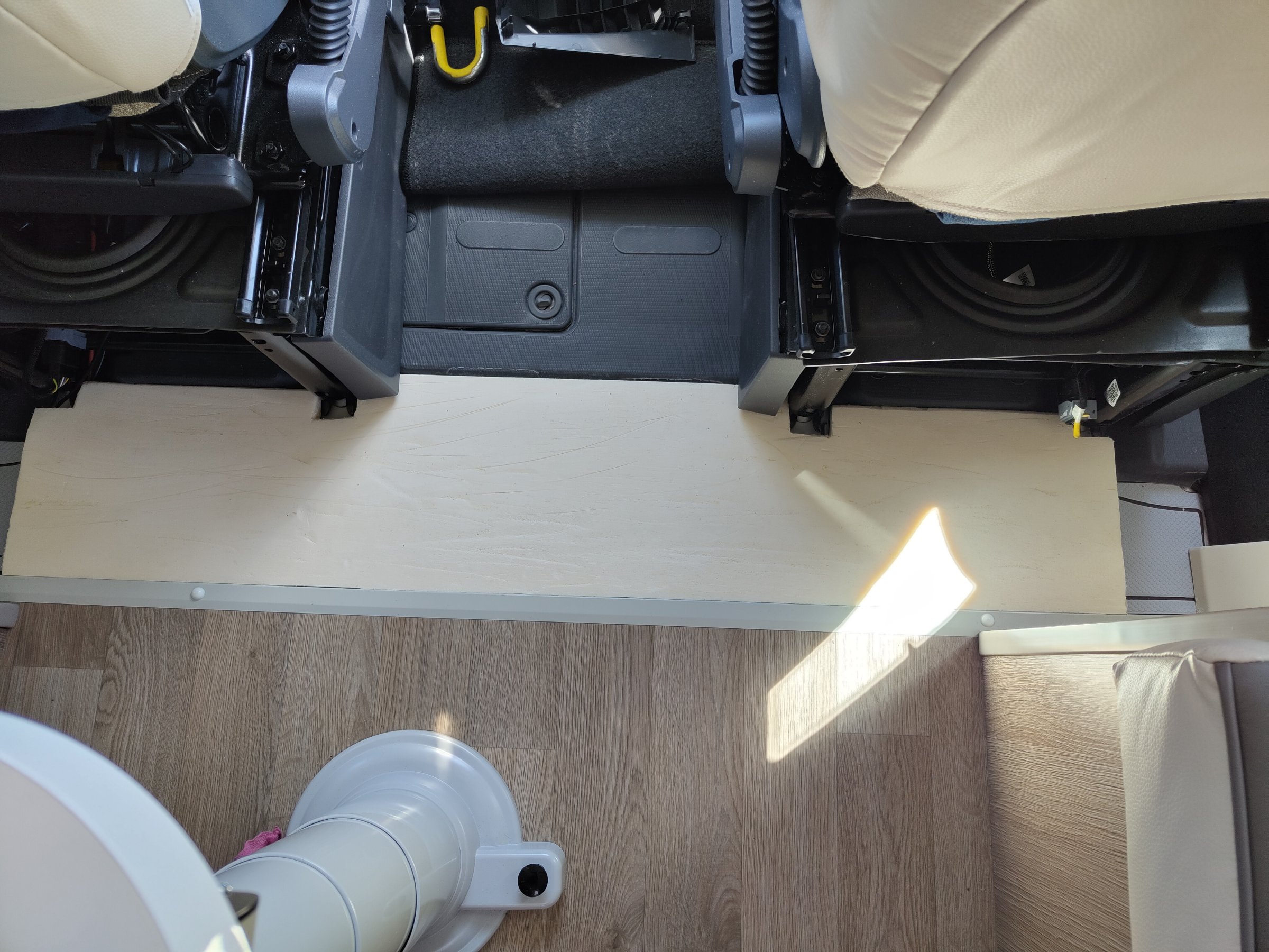 mich hat die Stufe zwischen Fahrerhaus und Wohnbereich von Anfang an gestört. Abhilfe bringt eine XPS-Platte in 4cm Stärke. Mit einem scharfen Messer in Form schneiden, mit einem Bandschleifer die Dicke anpassen und dann noch Nadelfilz aufkleben.