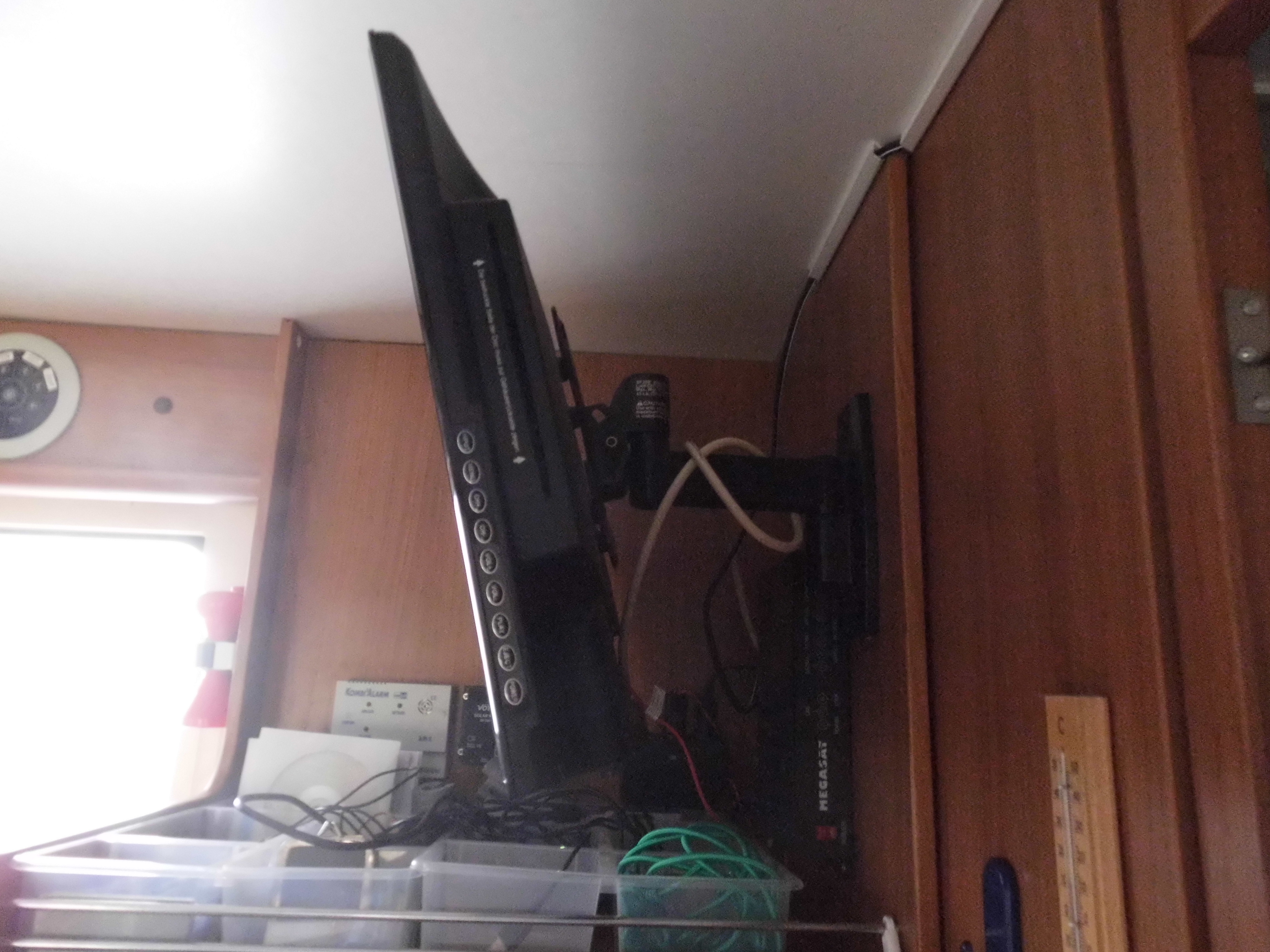 Wir haben ja den kleinen Kühlschrank. Da geht schon ein grösserer TV hin. Da ich meine Videoaufnahmen zeitnah sehen möchte brauche ich einen HDMI Anschluß. Full HD 1080i ist auch nicht verkehrt. Bei so kleinen Tv ist die Auflösung allerdings nicht so so gravierend . USB sowieso, Audio out für BT Kopfhörer, DVD Player int.Ausschalter an der Unterseite. Das ganze mit einem TV Arm an der Wand zum Schlafzimmer, dann Klappt es auch mit dem Winkel. SAT. Der hat 250 Euro gekostet. den anderen hab ich für 100 Euro abgegeben.
