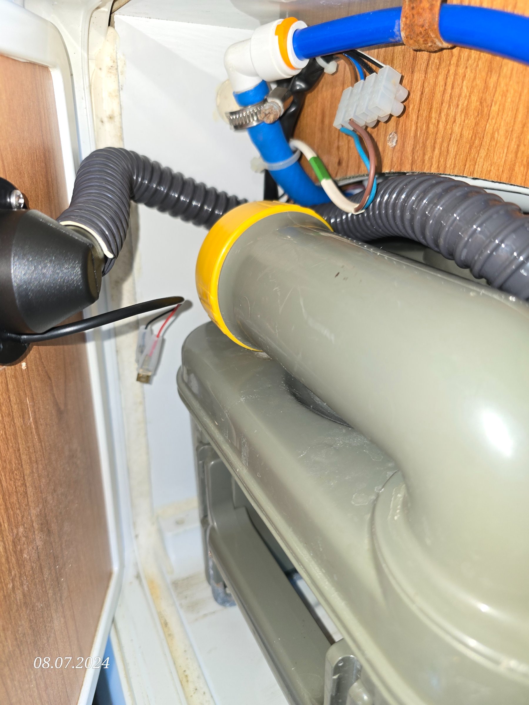 nachdem ich letztes Jahr den Grauwasser-Ablaß nach Aussen verlegt hatte und eine Kamera dort angebracht habe, war jetzt eine elektrische Betätigung des Abwasser-Schiebers fällig. Funktioniert mit einer kleinen Funk-Fernbedienung. Und alles für unter 40€.