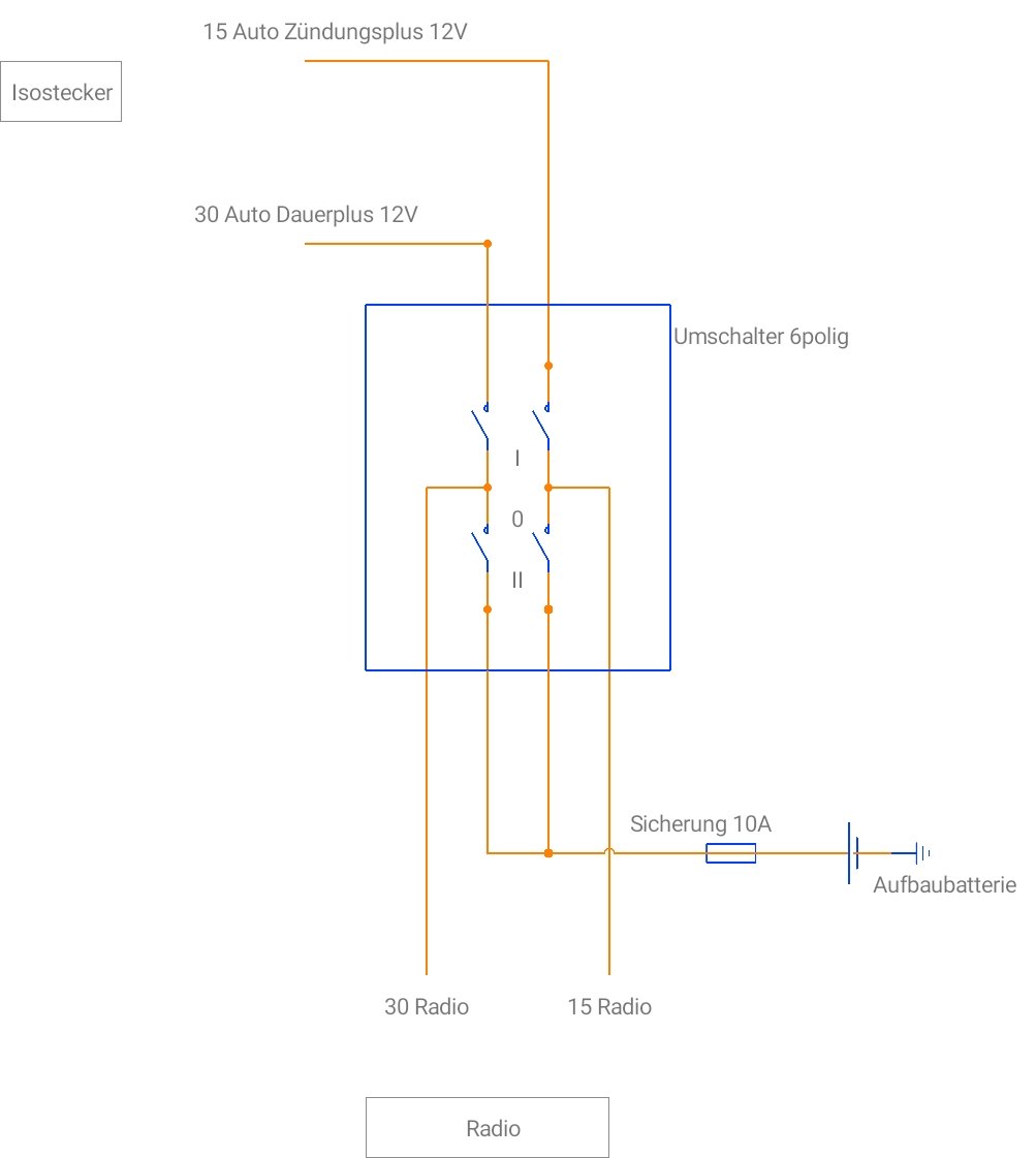 Außerdem hab ich einen Umschalter für das Radio eingebaut, um es im Stand über die Aufbaubatterie zu betreiben. Im Gegensatz zu der Lösung von @Vic (zwei 3polge Schalter), habe ich einen 6poligen Umschalter verbaut.