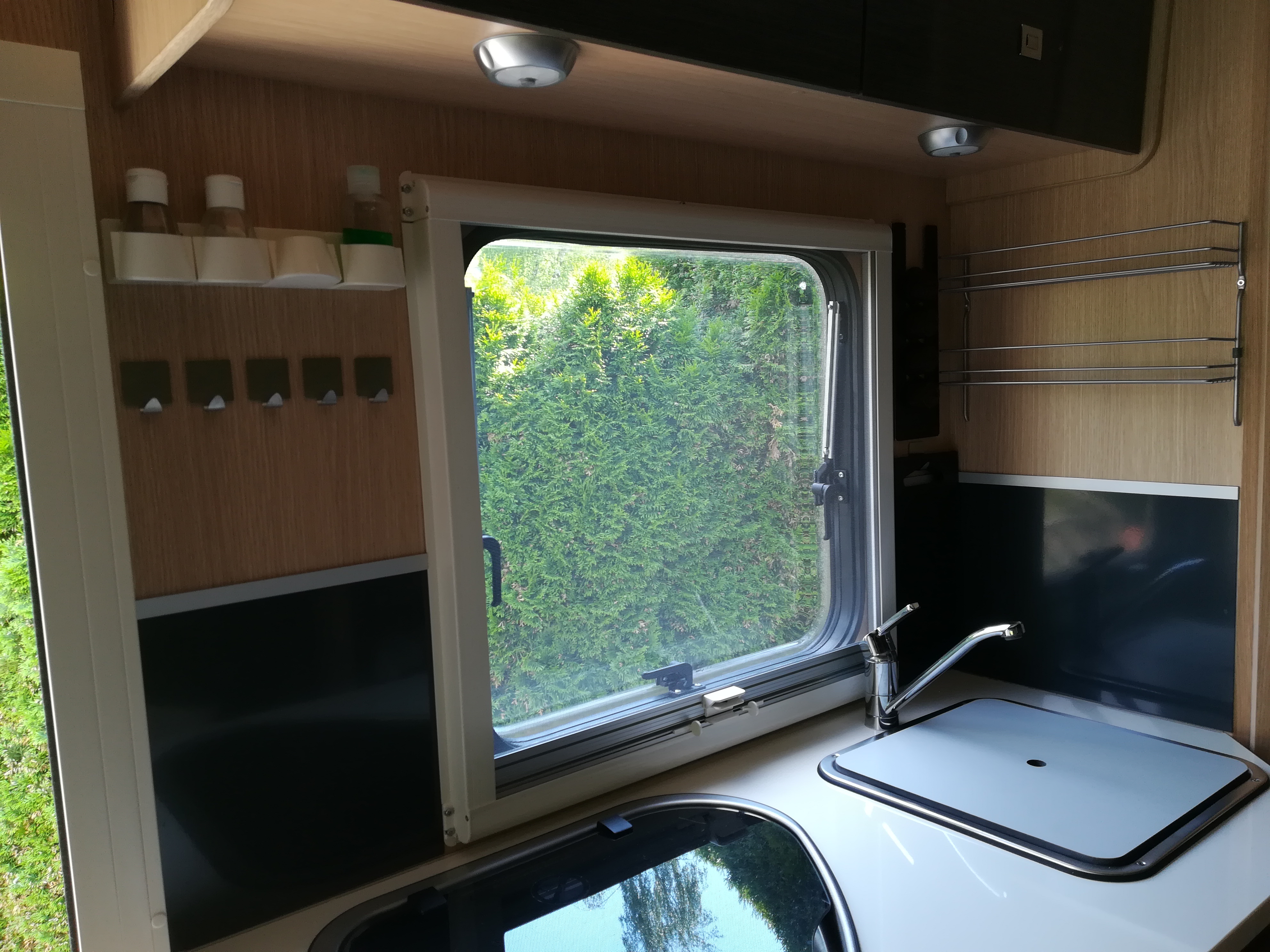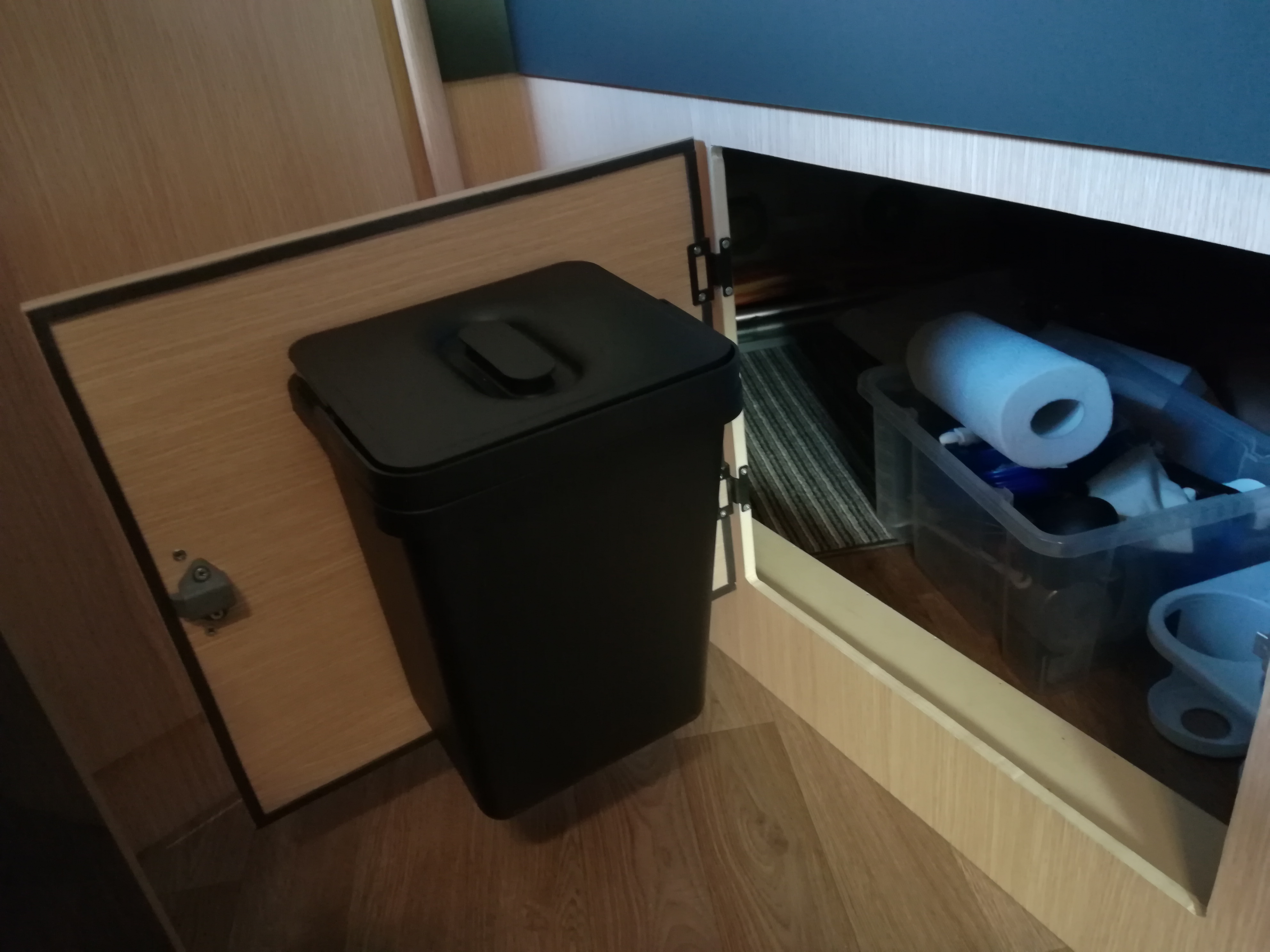 - den Stauraum komplett umgebaut (Zwischenwand raus etc.), die Klappe in den Innenraum eingebaut (im Stauraum war die totaler Blödsinn und man kam eh nicht drann), noch einen Mülleimer an der Innenseite angebracht, LED-Lichtband mit Ein/Aus Schalter, die Klappe für die Matratzeverlängerung umgesetzt und nun wird sie als Ablage genutzt