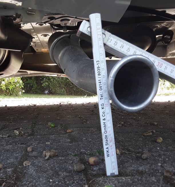 Bei mir ist der noch tiefer. Nur 8 cm Freiraum bis zur Straße. Habe ich mir heute angesehen. Ich werde die Befestigung lösen und dann etwas drehen. das dürfte dann reichen.