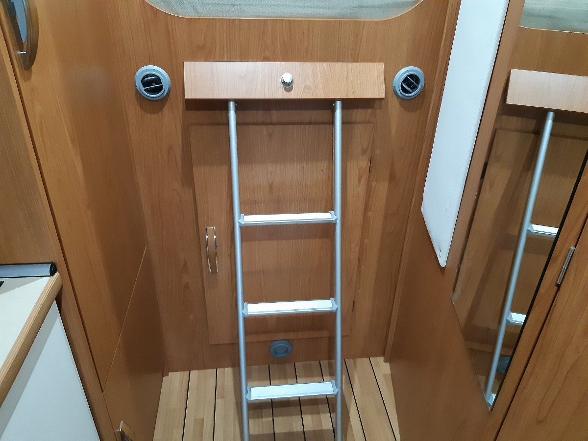 die Umluft zieht die Anlage durch die geöffnete Klappe der Leiter (siehe Bild). Bei großer Hitze öffne ich die Verbindungstür zur Garage noch ein kleines Stück. Ist aber eigentlich nicht notwendig, denn wenn die Leiterabdeckung vollständig geöffnet ist zieht es da ganz ordentlich durch. In unserem Vorgängerwomo hatten wir eine Truma Saphir in der Sitzkiste verbaut. Ich fand die aussen leiser und bilde mir ein, sie hat auch kälter gemacht. Kann aber wie gesagt auch Einbildung sein, denn das alte Womo war kürzer und der Einbauort über dem Kraftstofftank. Das hat evtl. die ausströmende Luft schon mal abgefangen und das Ausblasgeräusch gedämpft. Ich überlege noch mir einen Truma Ausblaskanal nachzurüsten. Dann darf man allerdings (laut Truma) die Heizfunktion nicht nutzen.