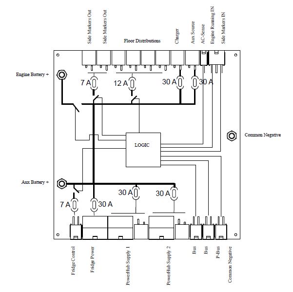 Das Schaubild zeigt Anschlüsse und Innenleben von meinem Steuergerät. Ist aus meinem Womo-Handbuch. Bei dir ist es wahrscheinlich bisschen anders, aber ähnlich. Man sieht, dass Fahrzeug- und Aufbaubatterie miteinander verschalten sind. Ist bei dir nicht so ein Bild drin? Wenn nicht, findest du das Schaubild, das genau zu deinem Steuergerät passt, vielleicht im Internet.