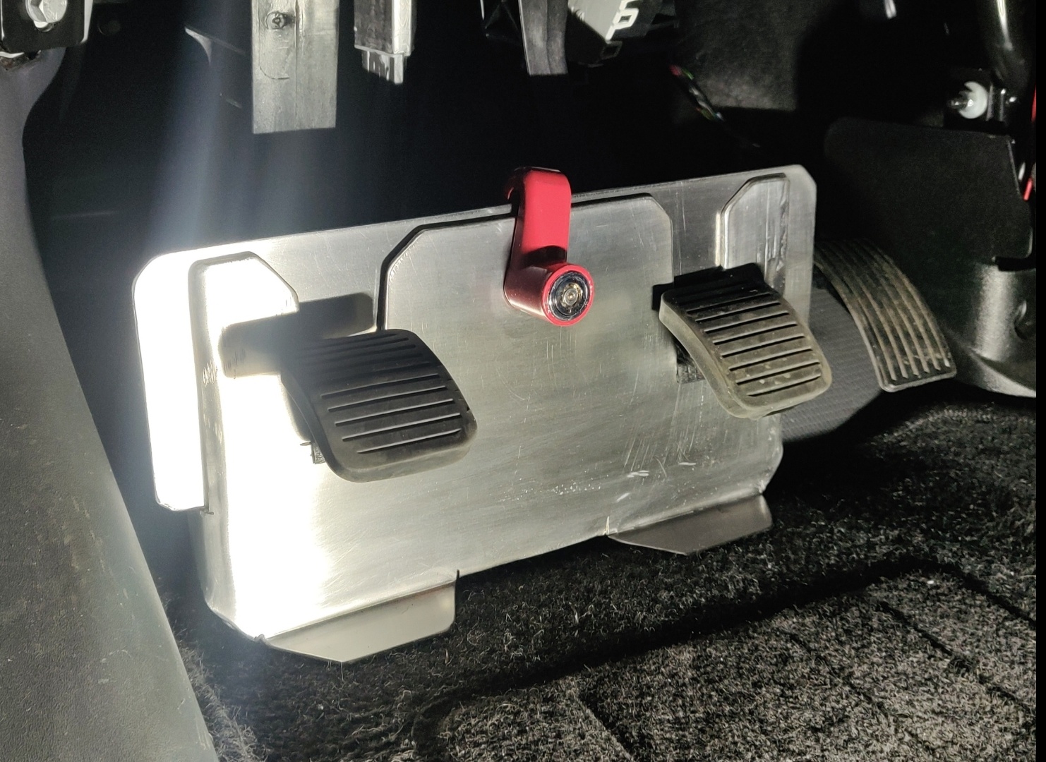 Diese Pedalsperre habe ich mir auch noch gebaut, das ist 3 mm V2A Blech und ein Bremsscheibenschloss zur Verriegelung.