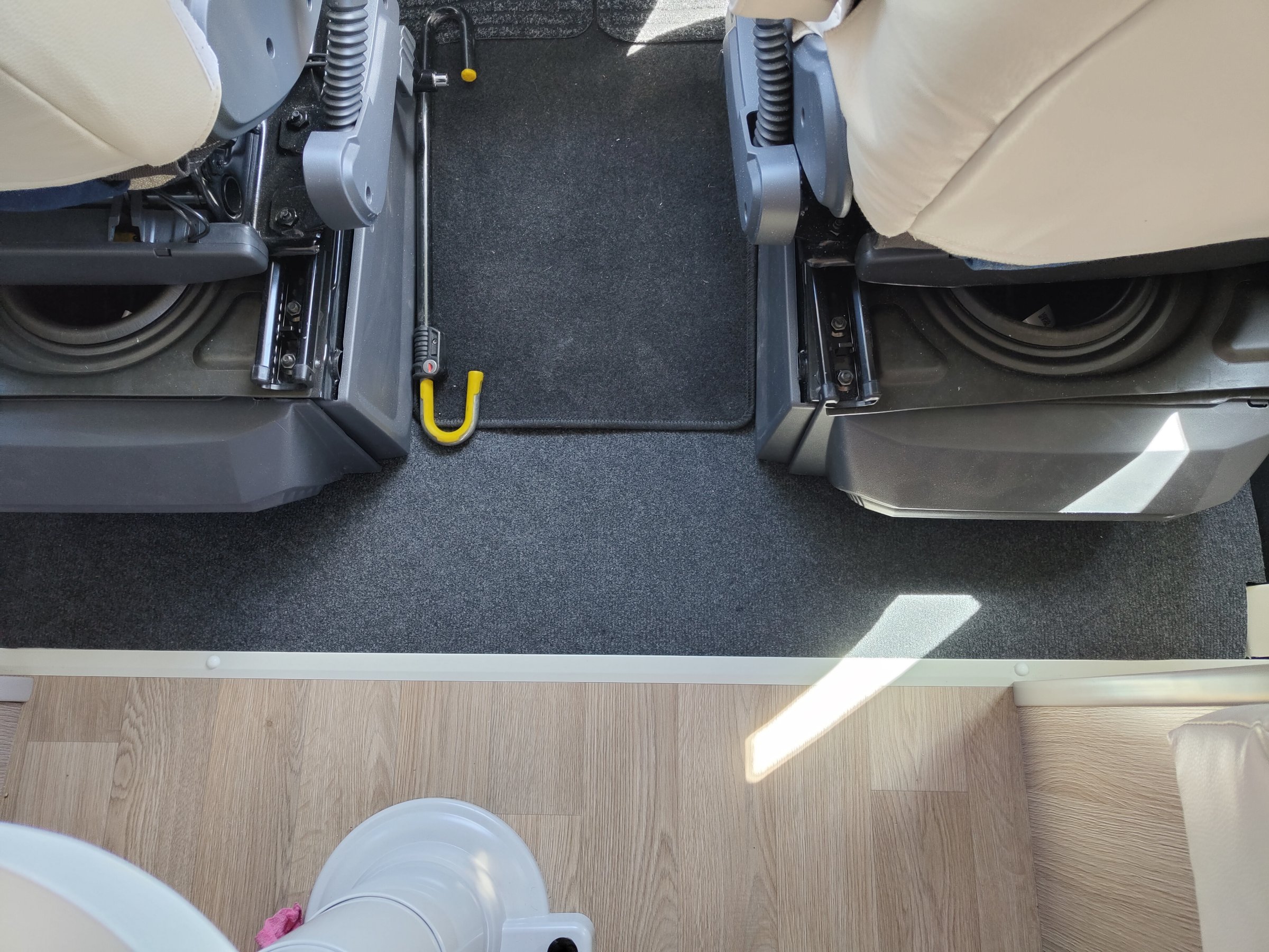 mich hat die Stufe zwischen Fahrerhaus und Wohnbereich von Anfang an gestört. Abhilfe bringt eine XPS-Platte in 4cm Stärke. Mit einem scharfen Messer in Form schneiden, mit einem Bandschleifer die Dicke anpassen und dann noch Nadelfilz aufkleben.